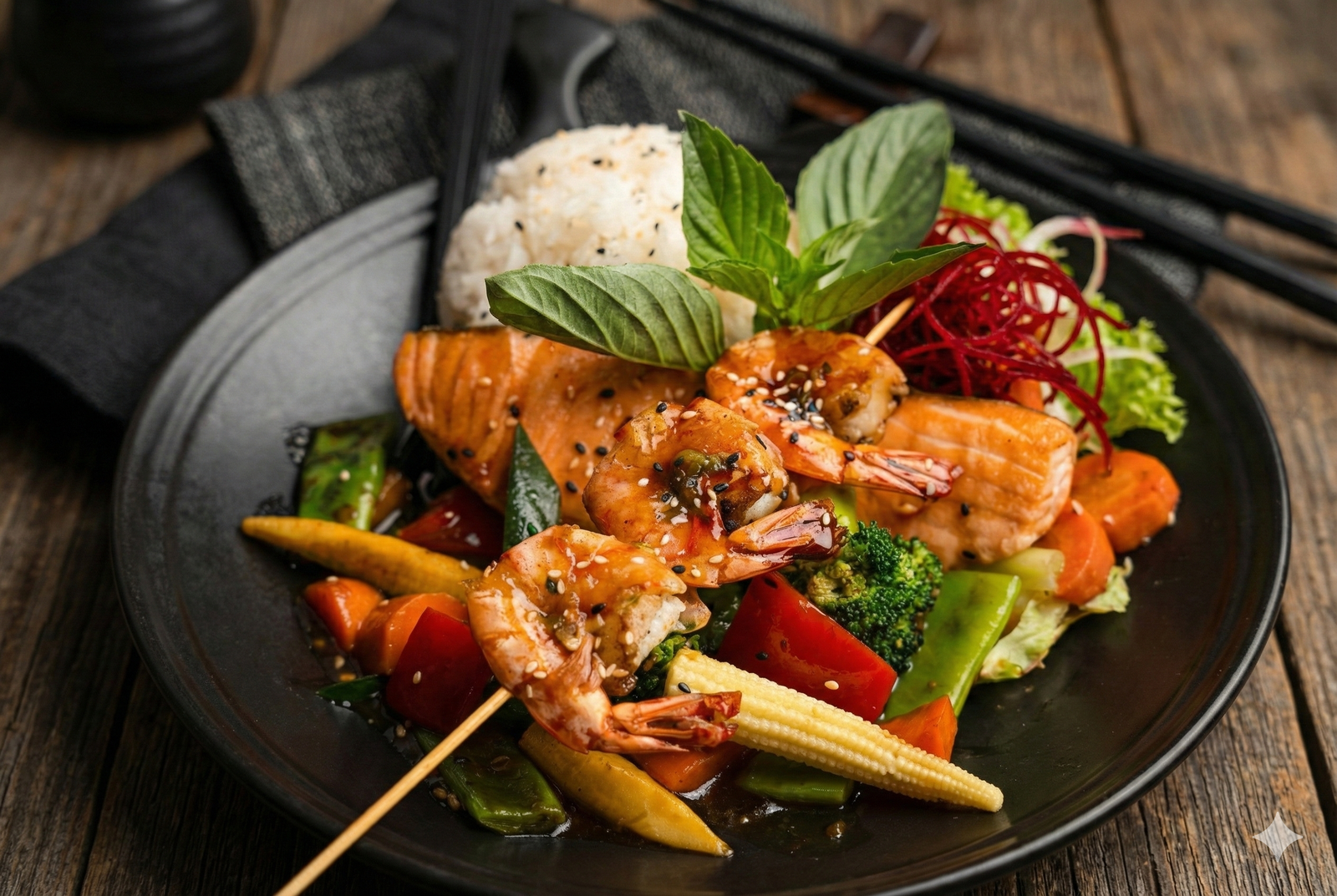 Glasiertes Lachsfilet, Blacktiger Shrimpsspießen, Wokgemüse in